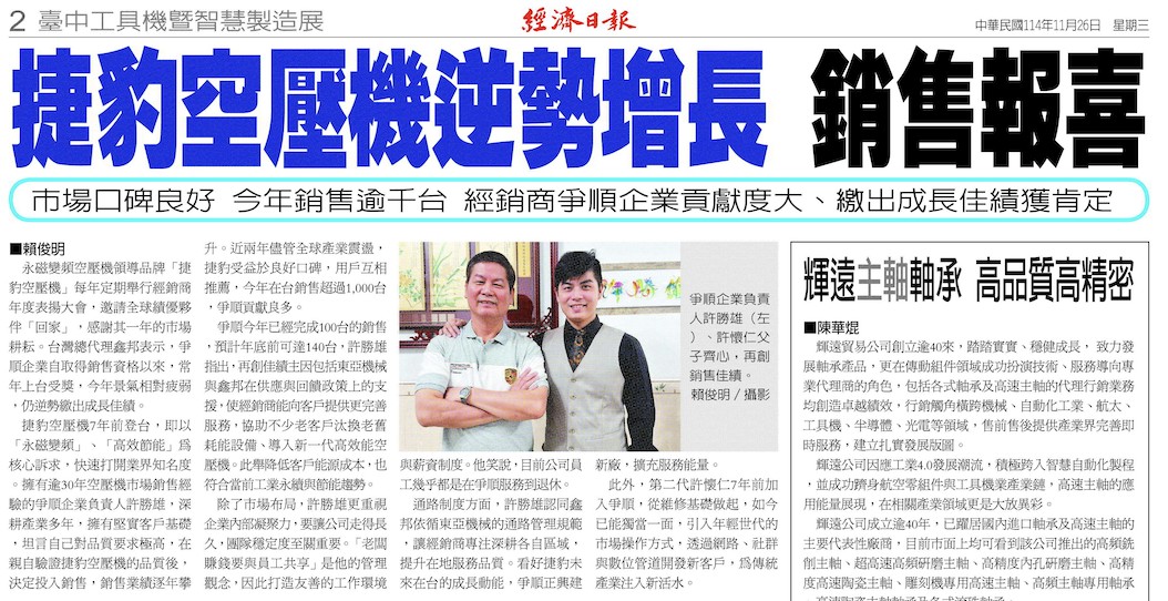 東亞機械開發製造高能效的捷豹空壓機以來,近年前推出「永磁變頻」、「高效節能」空壓機為核心訴求,能效受用戶肯定。擁有近千家客戶,銷售經驗豐富的爭順企業負責人許勝雄深耕產業30多年,秉持著專業、做事誠信及堅實客戶相挺的基礎,尤其自己對銷售的每樣產品,穩定的品質的要求也都會極為嚴苛的挑選。在親自深入了解捷豹空壓機的團隊體系跟驗證穩定的品質之後,才大膽的決定投入市埸代理銷售。近幾年儘管全球的產業有很多的震盪,但捷豹受益於超好的口碑,用過的用戶都會互相推薦,今年在台突破最高的的銷售數量的業績。爭順企業在銷售上則是名列前茅。許勝雄表示:再創佳績的主因為電價不斷在漲,加上節能補助,以及東亞機械與鑫邦的技術支援與穩定的配合供貨,讓通路能提供更快速完善的服務,幫助了不少的客戶汰舊換新,導入新一代高能效省電的空壓機。此舉除了大幅降低客戶購機成本,也符合當前工業永續與節能趨勢。